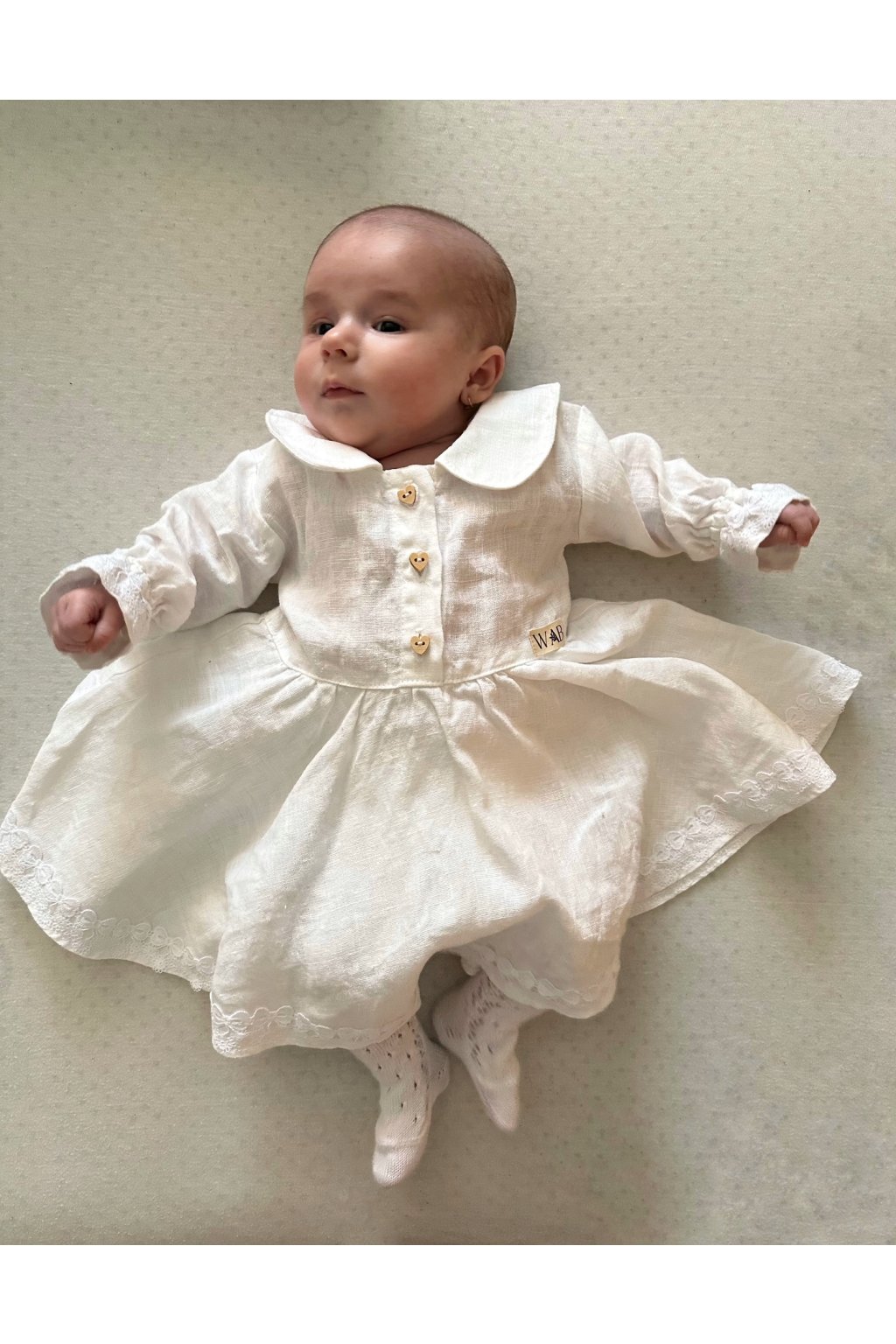 Rukávy sú zakončené jemnou gumičkou a ozdobením v podobe čipky, ktorá zdobí aj ramená šatičiek, čím im dodáva dievčenský a elegantný vzhľad. Vzadu sa šaty zapínajú po celej dĺžke na drevené gombíky, čo uľahčuje obliekanie a je praktické, keďže sa šaty neobliekajú cez hlavu – ideálne pre detičky, ktoré si to často nevychutnávajú :) Gombíky sú v tvare srdiečok, ale môžeme ich podľa želania vymeniť za kvietky alebo jednoduché okrúhle gombíky.