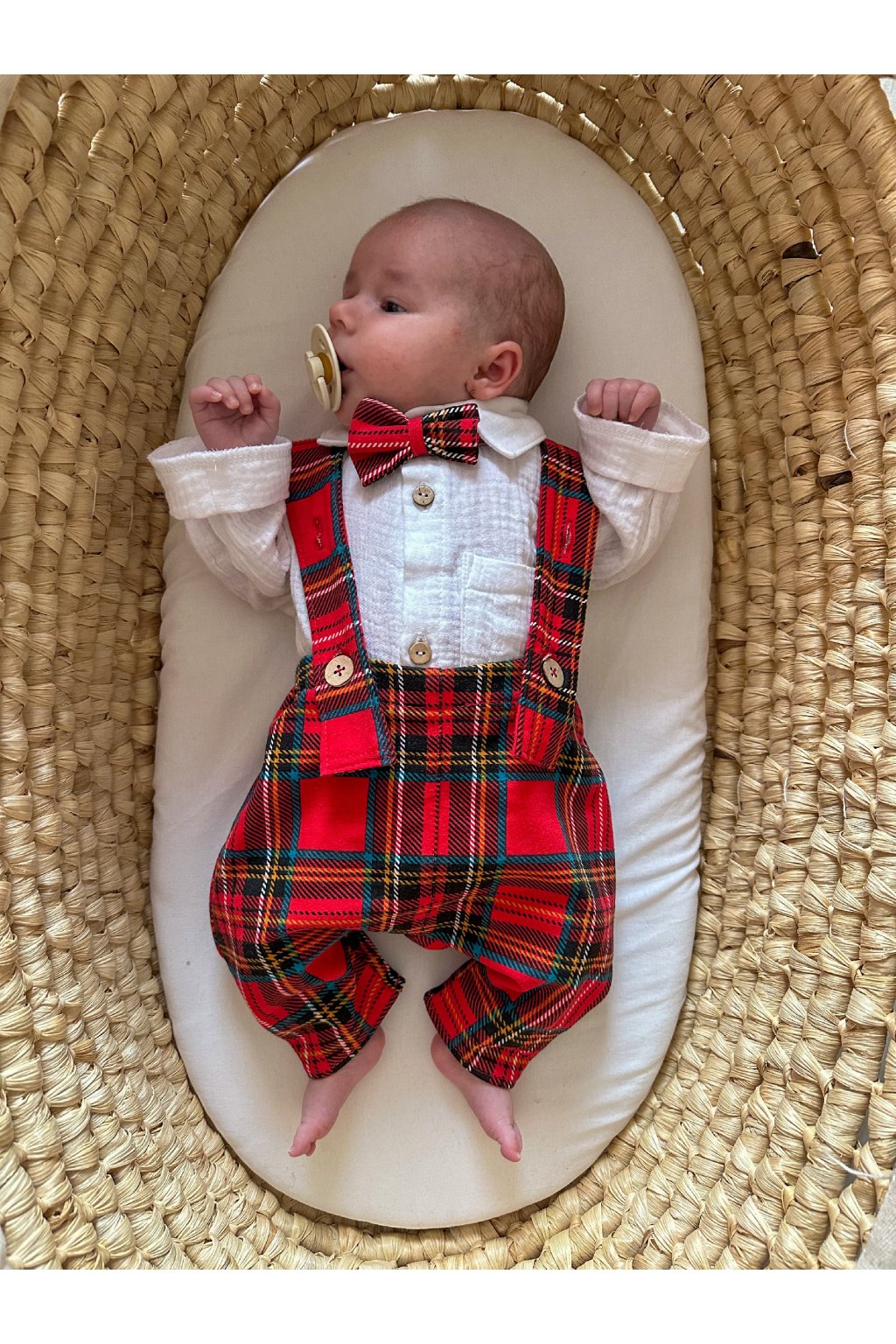 Súčasťou košele je aj zladený motýlik, ktorý pridáva outfitu sviatočný šmrnc a eleganciu, takže váš malý elegán bude neprehliadnuteľný na každých rodinných Vianočných oslavách, fotografických session alebo stretnutiach s priateľmi a rodinou.